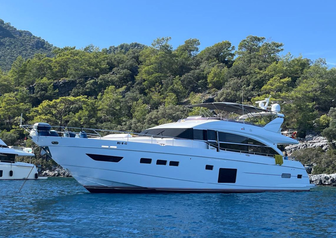 This 25.5m (83.66ft) yacht, built in 2016, boasts a beam of 5.74m (18.83ft) and a draft of 1.75m (5.74ft), contributing to its gross tonnage of 96. Designed for elegance and performance, its exterior styling is crafted by Olesinski Ltd., while Princess Yachts has meticulously designed its luxurious interior. Powered by twin Caterpillar C32A engines delivering 1,723 hp each, this yacht reaches an impressive maximum speed of 34 knots and maintains a comfortable cruising speed of 18 knots, ensuring a smooth and powerful sailing experience.