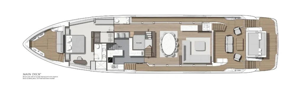 From the expansive flybridge to the elegantly appointed owner’s suite, the 94 Yacht is engineered for ultimate comfort and flexibility. Large social zones, dedicated sunbathing decks, and advanced navigation make every outing remarkable.